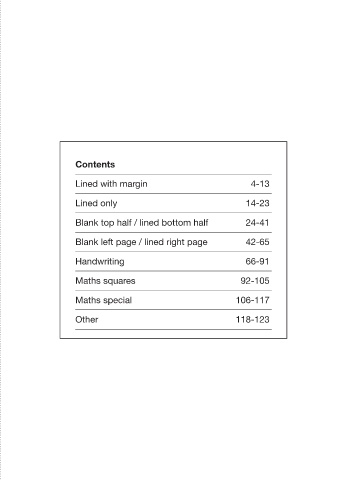 Contents Lined with margin 4-13 Lined only 14-23 Blank top half / lined bottom half 24-41 Blank left page / lined right page 42-65 Handwriting 66-91 Maths squares 92-105 Maths special 106-117 Other 118-123