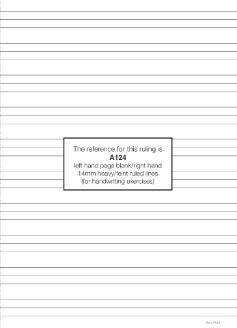 The reference for this ruling is A124 left hand page blank/right hand 14mm heavy/feint ruled lines (for handwriting exercises) Ref: A124